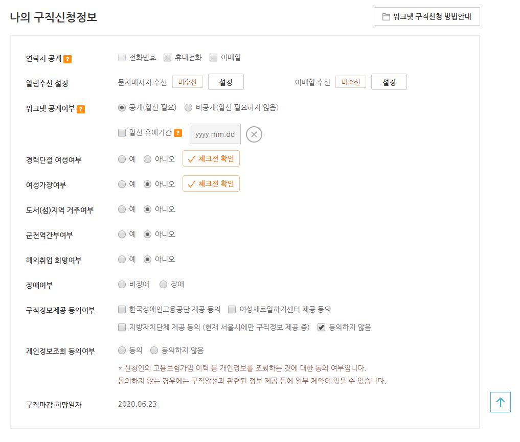 그러면 나의 구직신청 정보라는 이런 게 나오는데 이것들을 선택 및 작성해주면 된다! 엄청 간단함! 연락처, 알림수신, 워크넷 공개여부, 해외취업 희망여부, 경력단절 여성여부, 장애여부 등이 있으니 자신에게 맞게 선택하길