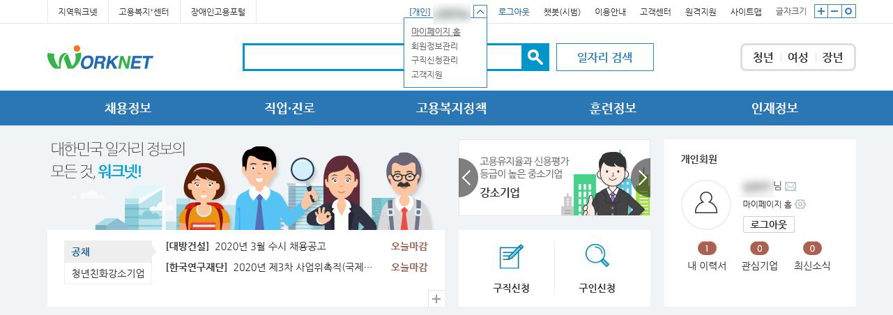 회원가입 → 로그인 → 마이페이지 홈 (홈페이지 상단) → 이력서 등록 → 자기소개서 등록 → 워크넷 구직신청 →