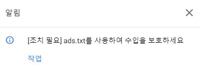 바로 애드센스에 로그인해서 보니 또 ads.txt 관련 알림까지 와있었고